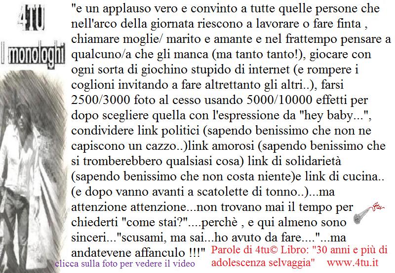 “E un applauso serio e convinto a tutte quelle persone che nell’arco della giornata riescono a lavorare o fare finta , chiamare moglie/marito e amante e nel frattempo pensare a qualcuno/a che gli manca..(ma tanto tanto!) giocare con ogni sorta di giochino stupido di internet (e rompere i coglioni invitando a fare altrettanto gli altri) farsi 2500/3000 foto al cesso usando 5000/10000 effetti per dopo scegliere quella con l’espressione da “hey baby…”condividere link politici..(sapendo benissimo che non ne capiscono un cazzo..) link amorosi..(sapendo benissimo che si tromberebbero qualsiasi cosa..)link di solidarietà (sapendo benissimo che non costa niente..) e link di cucina..(sapendo benissimo..che non sanno cucinaare…e dopo vanno avanti a scatolette di tonno!!)..ma attentione attenzione non trovano mai il tempo per chiederti..”come stai?” perchè, e qui almeno sono sinceri….”scusami, ho avuto da fare…”ma andatevene affanculo! 4tu© Libro : 30 anni e più di adolescenza selvaggia