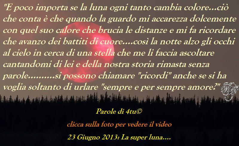“E poco importa se la luna ogni tanto cambia colore…ciò che conta è che quando la guardo mi accarezza dolcemente con quel suo calore che brucia le distanze e mi fa ricordare che avanzo dei battiti di cuore….così la notte alzo gli occhi al cielo in cerca di una stella che me li faccia ascoltare cantandomi di lei e della nostra storia rimasta senza parole……….si possono chiamare “ricordi” anche se si ha voglia soltanto di urlare “sempre e per sempre amore?”