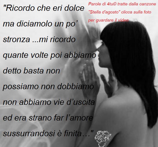 E portami dove ti pare dove il mondo non finisce quando nasce il sole dove puoi ballare libera mia stella d’agosto e vederti s’alzo gli occhi pure a mezzogiorno..Buonasera bambolina dimmi tu che fare…buonasera piccolina hai paura d’amare…scappa è tardi ma ricorda non ti preoccupare..se hai bisogno in ogni dove mi vedrai arrivare….