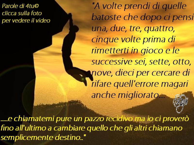 “A volte prendi di quelle batoste che dopo ci pensi una, due, tre, quattro, cinque volte prima di rimetterti in gioco e le successive sei, sette, otto, nove, dieci per cercare di rifare quell’errore magari anche migliorato….e chiamatemi pure un pazzo recidivo, ma io ci proverò fino all’ultimo a cambiare quello che gli altri chiamano semplicemente destino..”4tu© libro: 30 anni e più di adolescenza selvaggia