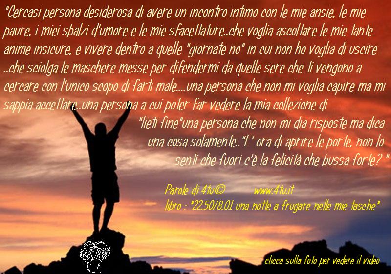 “Cercasi persona desiderosa di avere un incontro intimo con le mie ansie, le mie paure, i miei sbalzi d’umore e le mie sfacettature..che voglia ascoltare le mie tante anime insicure, e vivere dentro a quelle “giornate no” in cui non ho voglia di uscire ..che sciolga le maschere messe per difendermi da quelle sere che ti vengono a cercare con l’unico scopo di farti male….una persona che non mi voglia capire ma mi sappia accettare..una persona a cui poter far vedere la mia collezione di “lieti fine”una persona che non mi dia risposte ma dica una cosa solamente..”E’ ora di aprire le porte, non lo senti che fuori c’è la felicità che bussa forte? ” 4tu© libro: “22.50/8.01 una notte a frugare nelle mie tasche”
