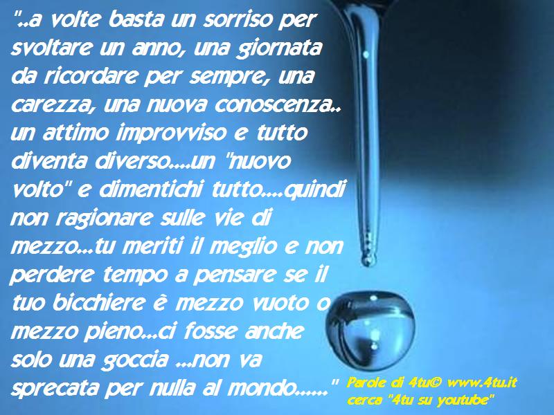 “.. e non perdere tempo a pensare se il tuo bicchiere è mezzo vuoto o mezzo pieno…ci fosse anche solo una goccia …non va sprecata per nulla al mondo……” 4tu (“4tu- pensieri positivi 2014 ” su youtube)