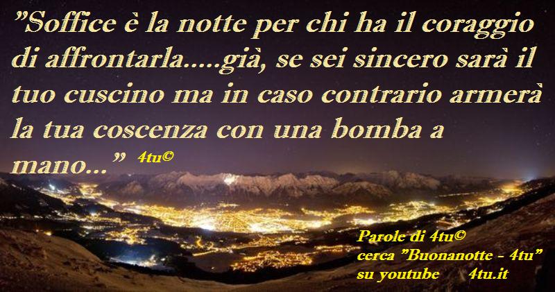 “Sai come capisci che tipo di notte sarà?..dal tramonto..perchè, se ti fermi a guardare il cielo e ti viene a trovare un sospiro beh…sei fottuto…..ed è solo l’antipasto……come primo avrai qualche bel ricordo di quelli che “ma io l’avevo cancellato!”….come secondo è d’obbligo “il rimorso” e come dolce kg di “se potessi tornare indietro….”….ma il pezzo forte è quando ti portano il conto…..ogni volta è salato, ogni volta paghi troppo….ogni volta la vita non ti fa mai uno sconto”..4tu© (“4tu – dimenticavo, buonanotte ” su youtube)
