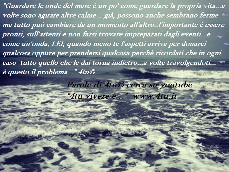“Guardare le onde del mare è un po’ come guardare la propria vita…a volte sono agitate altre calme .. già, possono anche sembrano ferme ma tutto può cambiare da un momento all’altro..l’importante è essere pronti, sull’attenti e non farsi trovare impreparati dagli eventi…e come un’onda, LEI, quando meno te l’aspetti arriva per donarci qualcosa oppure per prendersi qualcosa perchè ricordati che in ogni caso tutto quello che le dai torna indietro…a volte travolgendoti…