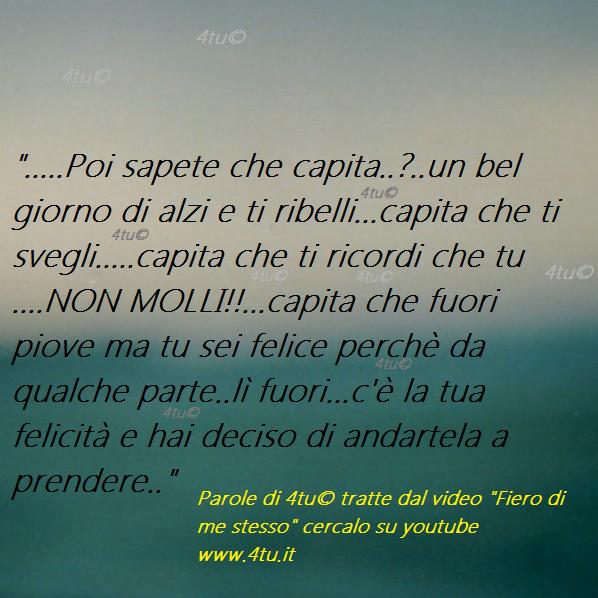 “Capitano momenti no..e capita che durino tanto…troppo….capita che ti senti immobilizzato …hai una voglia di vivere incredibile ma una paura di sbagliare che ti brucia lentamente…e gridi, gridi più forte che puoi ma il mondo ti sembra una stanza che putroppo di confini ne ha eccome…sono quelli della tua testa……capita che il sole sia freddo e non riesca a scaldarti le giornate…..poi sapete che capita..?..un bel giorno di alzi e ti ribelli…capita che ti svegli…..capita che ti ricordi che tu ….NON MOLLI!!…capita che fuori piove ma tu sei felice perchè da qualche parte..lì fuori…c’è la tua felicità e hai deciso di andartela a prendere..”