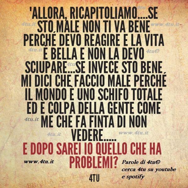 “Allora, ricapitoliamo…se sto male non ti va bene perchè la vita è bella e io non la devo sciupare..se invece sto bene mi dici che fanno male perchè il mondo è uno schifo totale ed è colpa della gente come me che fa finta di non vedere…e dopo sarei io quello che ha problemi?”