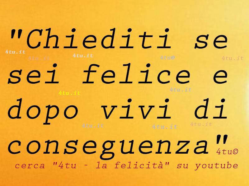 “Forse il problema è che dagli altri ci aspettiamo troppo e da noi invece poco o niente…siamo esigenti quando si tratta di volere che le altre persone ci trattino bene, ci amino alla follia, ci rispettino, ci adorino…ma quando dobbiamo farci un esamino di coscenza ci perdoniamo tutto e lo passiamo a pieni voti!!…già, diamo sempre la colpa agli altri…non siamo felici?colpa di uno stronzo/a che ci ha preso per il culo…colpa di una società che non ci capisce….colpa di un lavoro che non ci valorizza..colpa di un politico che ruba…colpa della tv spazzatura…..e l’opzione colpa nostra dov’è finita???…l’avete letta come alla fine delle pubblicità al triplo della velocità ? oppure è nascosta dentro all’ennesimo p.s alla fine di un contratto pieno di clausole e regolette….quando c’è da pagare la felicità il conto non lo porta a chi ti sta vicino ma a te…quindi prima di alzare la voce, di urlare , di lamentarti, di dire che costa troppo fatti solamente una domanda…”sono felice?”….e dopo non cercare la risposta dentro gli occhi di qualcuno/a…perchè se questi li chiudono per un attimo cosa fai??..li insulti???….chiediti se sei felice e dopo vivi di conseguenza….essere contenti o no è una solo TUA SCELTA! ” 4tu©