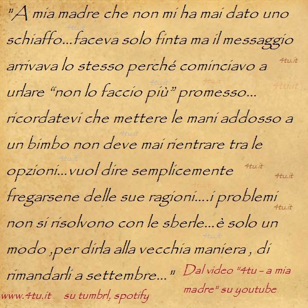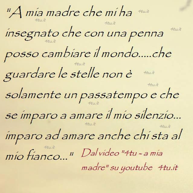 “La più grande delle canzoni d’amore sarà sempre per la mamma…..sono qui ,grazie a lei, a scrivere di lei….e non so come cominciare perchè se non si può spiegare la vita figuratevi chi ce l’ha data………inizio con un grazie mamma perchè sei stata, sei e sarai sempre la mia forza!” di 4tu©