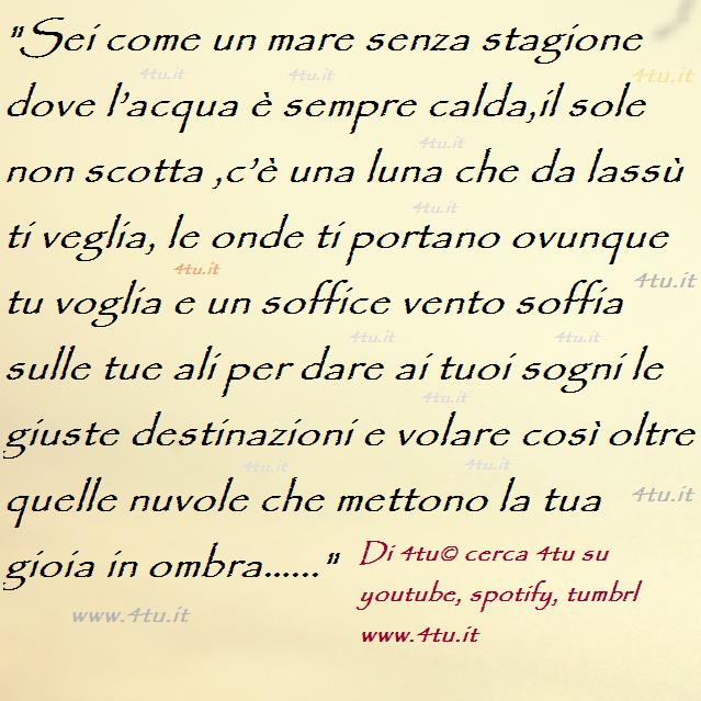Testo, voce e parole:”La più grande delle canzoni d’amore sarà sempre per la mamma…..sono qui ,grazie a lei, a scrivere di lei….e non so come cominciare perchè se non si può spiegare la vita figuratevi chi ce l’ha data………inizio con un grazie mamma perchè sei stata, sei e sarai sempre la mia forza sei come un mare senza stagione dove l’acqua è sempre calda,il sole non scotta ,c’è una luna che da lassù ti veglia, le onde ti portano ovunque tu voglia e un soffice vento soffia sulle tue ali per dare ai tuoi sogni le giuste destinazioni e volare così oltre quelle nuvole che mettono la tua gioia in ombra…