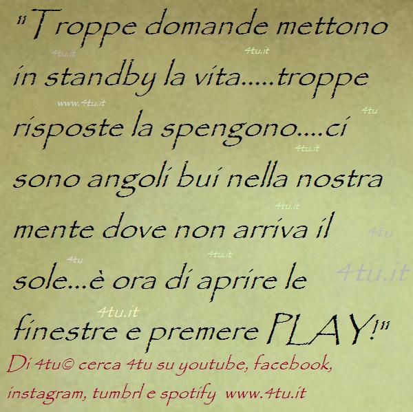 “Troppe domande mettono in standby la vita…..troppe risposte la spengono….ci sono angoli bui nella nostra mente dove non arriva il sole…è ora di aprire le finestre e premere PLAY!” di 4tu©