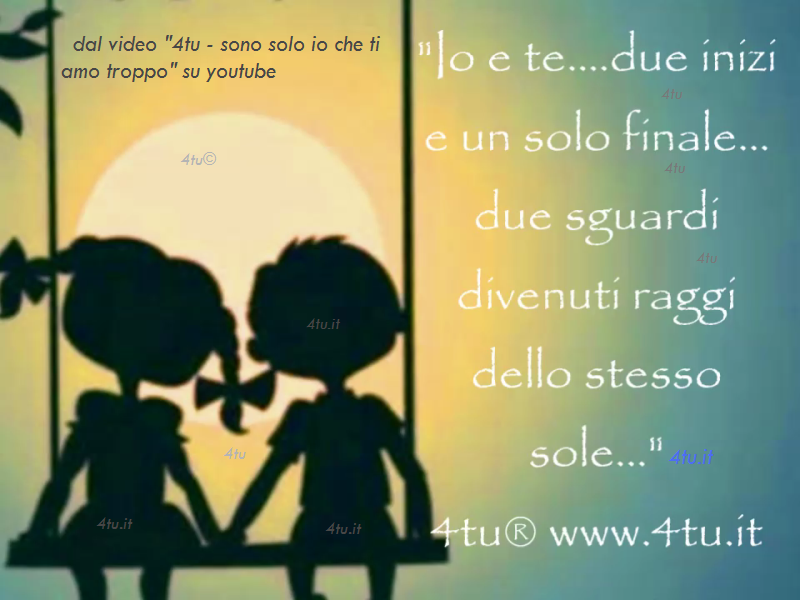 Testo canzone d’amore bellissima con testo : “Lo sai vero che il cielo colleziona i miei pensieri…?..li usa per vestire di luce quelle stelle che ci fanno sognare…solo i doppioni non riesce a sopportare e quando succede si lamenta, brontola, sbuffa , sbotta e comincia a gridare….quindi non ti preoccupare se stanotte sentirai lampi e tuoni prima di abbandonarti al tuo dolce sonno..sono solo io che ti penso a più non posso..sono solo io che ti amo troppo…..io e te due inizi e un solo finale..due sguardi divenuti raggi dello stesso sole..” di 4tu©