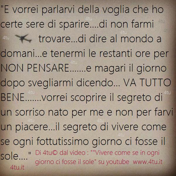 Testo: “e vorrei parlarvi della voglia che ho certe sere di sparire….di non farmi trovare…di dire al mondo a domani…e tenermi le restanti ore per NON PENSARE…….e magari il giorno dopo svegliarmi dicendo… VA TUTTO BENE…….vorrei scoprire il segreto di un sorriso nato per me e non per farvi un piacere…il segreto di vivere come se IN ogni fottutissimo giorno ci fosse il sole….” di 4tu©