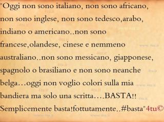 “Oggi non sono italiano, non sono africano, non sono inglese, non sono tedesco,arabo, indiano o americano..non sono francese,olandese cinese e nemmeno australiano..non sono messicano, giapponese, spagnolo o brasiliano e non sono neanche belga…oggi non voglio colori sulla mia bandiera ma solo una scritta….BASTA!!